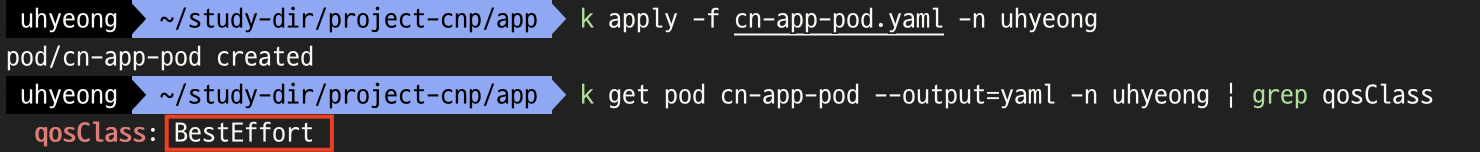 - μ μμ±ν λ§€λνμ€νΈ νμΌλ‘ pod μμ± ν Qos Classκ° BestEffortλ‘ ν λΉλ κ²μ νμΈ !