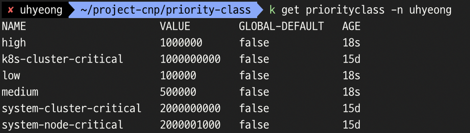 - 만약 파드에 PriorityClass가 명시가 되지 않았을 경우 value값은 0이며 우선 순위가 최하가 된다.