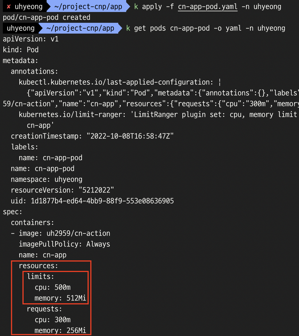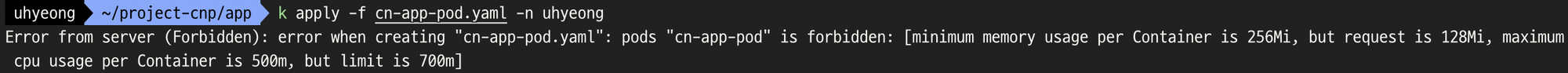 - μμ±λλ νλμ λͺ¨λ 컨ν μ΄λμ μμ²λμ΄ LimitRangeμ λͺ μλμ΄ μλ min κ°μ λ°λ₯΄λμ§ νμΈνλ€.