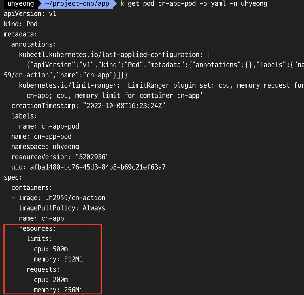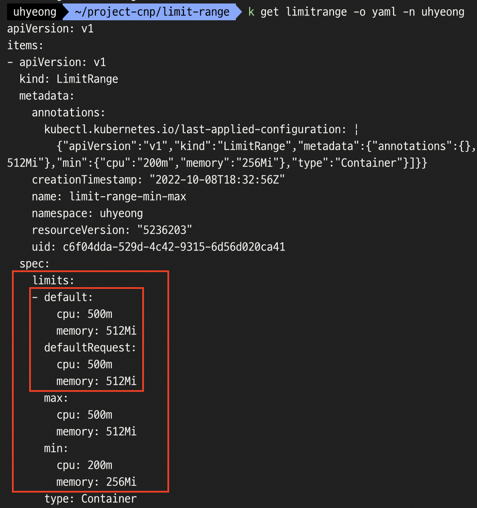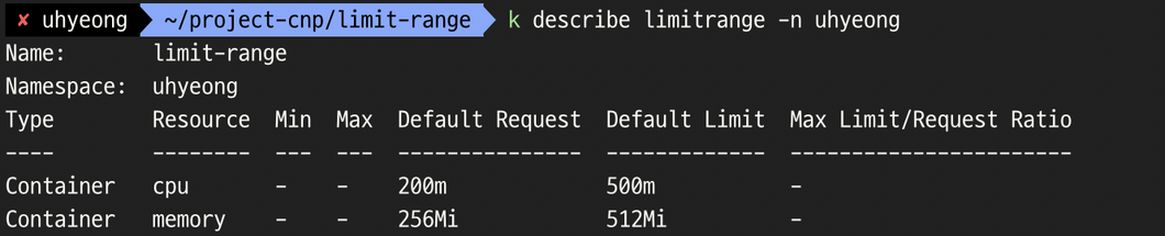- κ°μ νμΈν΄λ³΄λ©΄ μμμ μμ±ν LimitRangeμ μν΄ μ€μ λ κ°μ΄λΌλ κ²μ νμΈν μ μλ€.