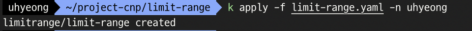 - μ λ§€λνμ€νΈλ‘ LimitRangeλ₯Ό λ΄ λ€μμ€νμ΄μ€μ μμ±νμλ€.