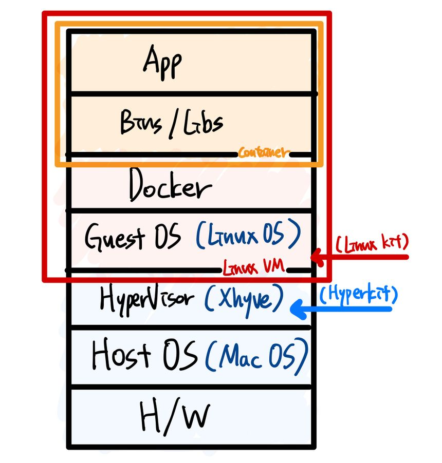 - Mac OS์์์ Hypervisor์ธ Xhyve๋ HyperKit๋ฅผ ์ฌ์ฉํ์ฌ Host๋ด VM์ ์์ฑํ๋ค.
