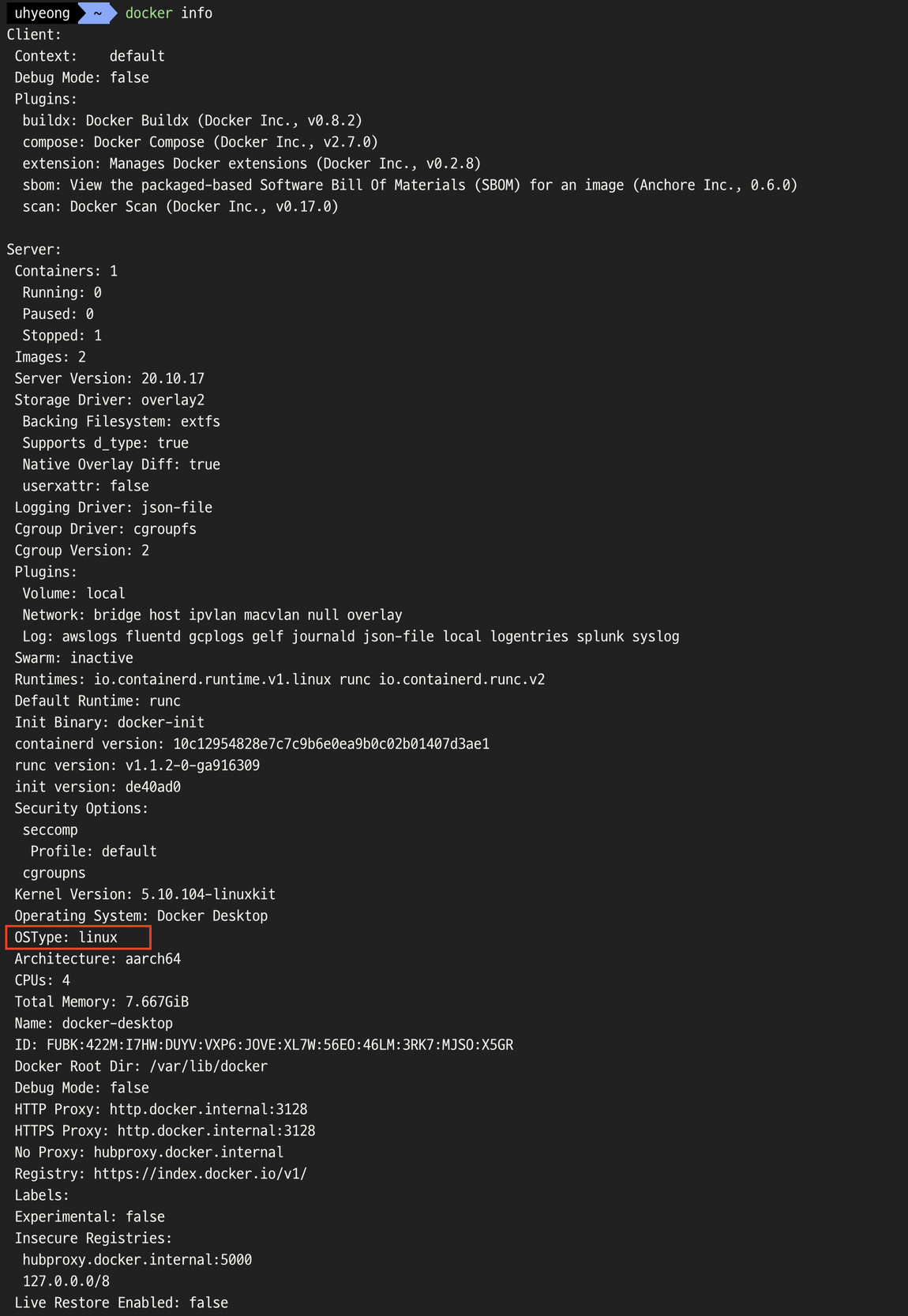 - $ docker info → Guest OS๊ฐ Linux OS์ธ ๊ฒ์ ํ์ธ