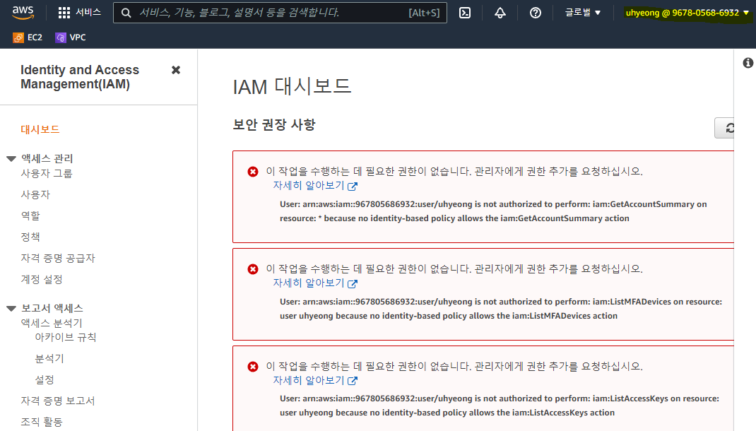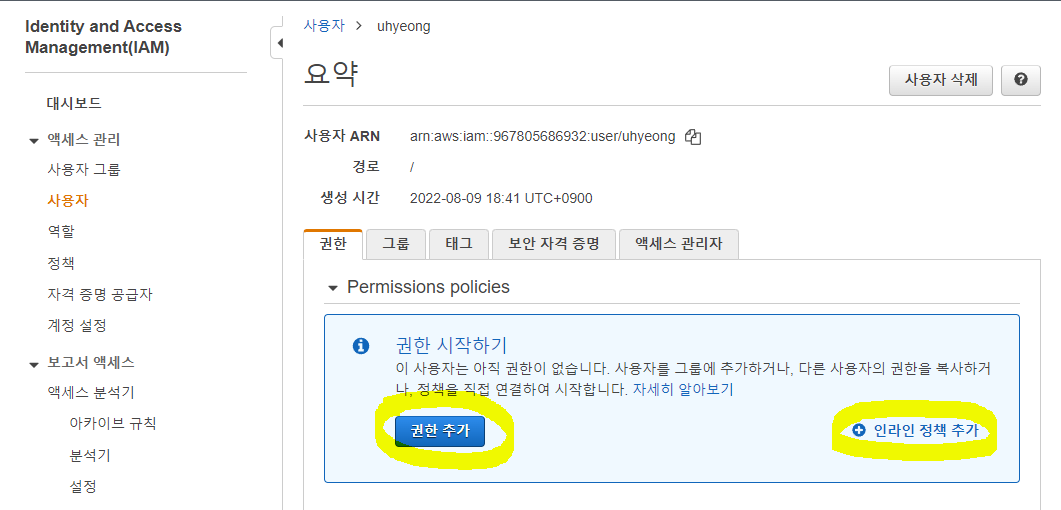 - 인라인 정책을 추가하여 권한을 직접 사용자에게 부여하기