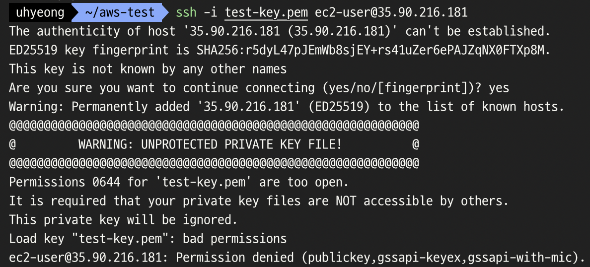 ⇒ 키 페어 파일의 권한이 너무 허용되어 있어서 생기는 권한 오류 발생