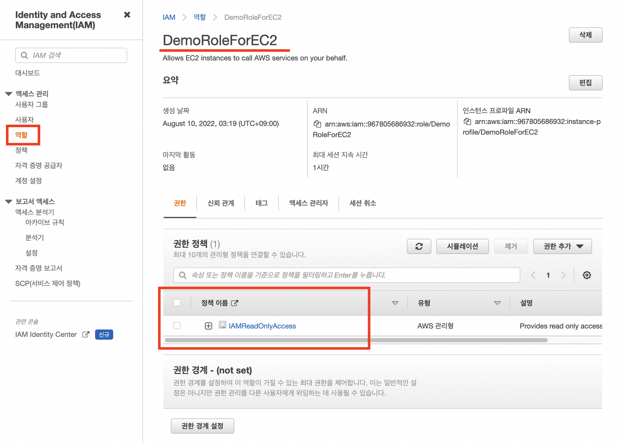- 만들어 놓은 역할(DemoRoleForEC2)에 연결된 정책은 IAMReadOnlyAccess
