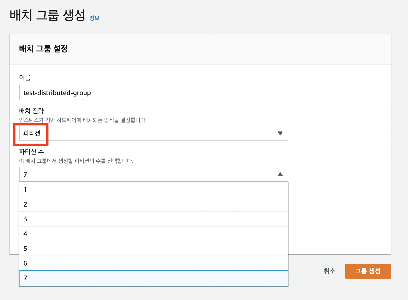 - 배치 그룹 생성 - 배치 전략 (파티션) - 파티션 수 *최대 7개