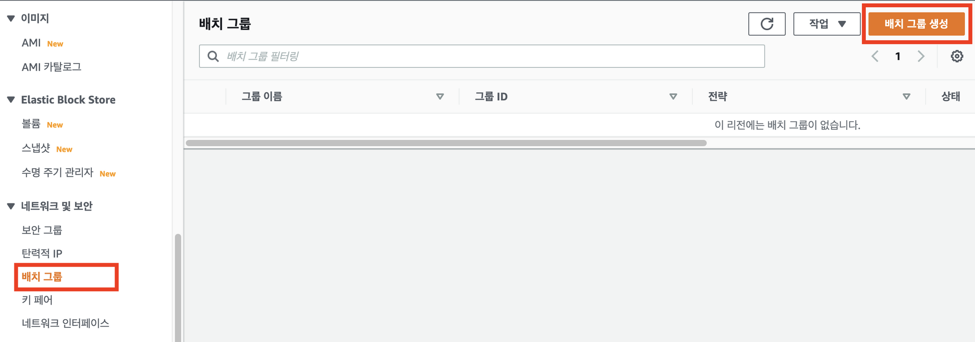 - EC2 - 네트워크 및 보안 - 배치 그룹 - 배치 그룹 생성
