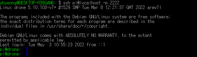 uhyeong@DESKTOP-R39GAN6:~$ ssh pi@localhost -p 2222