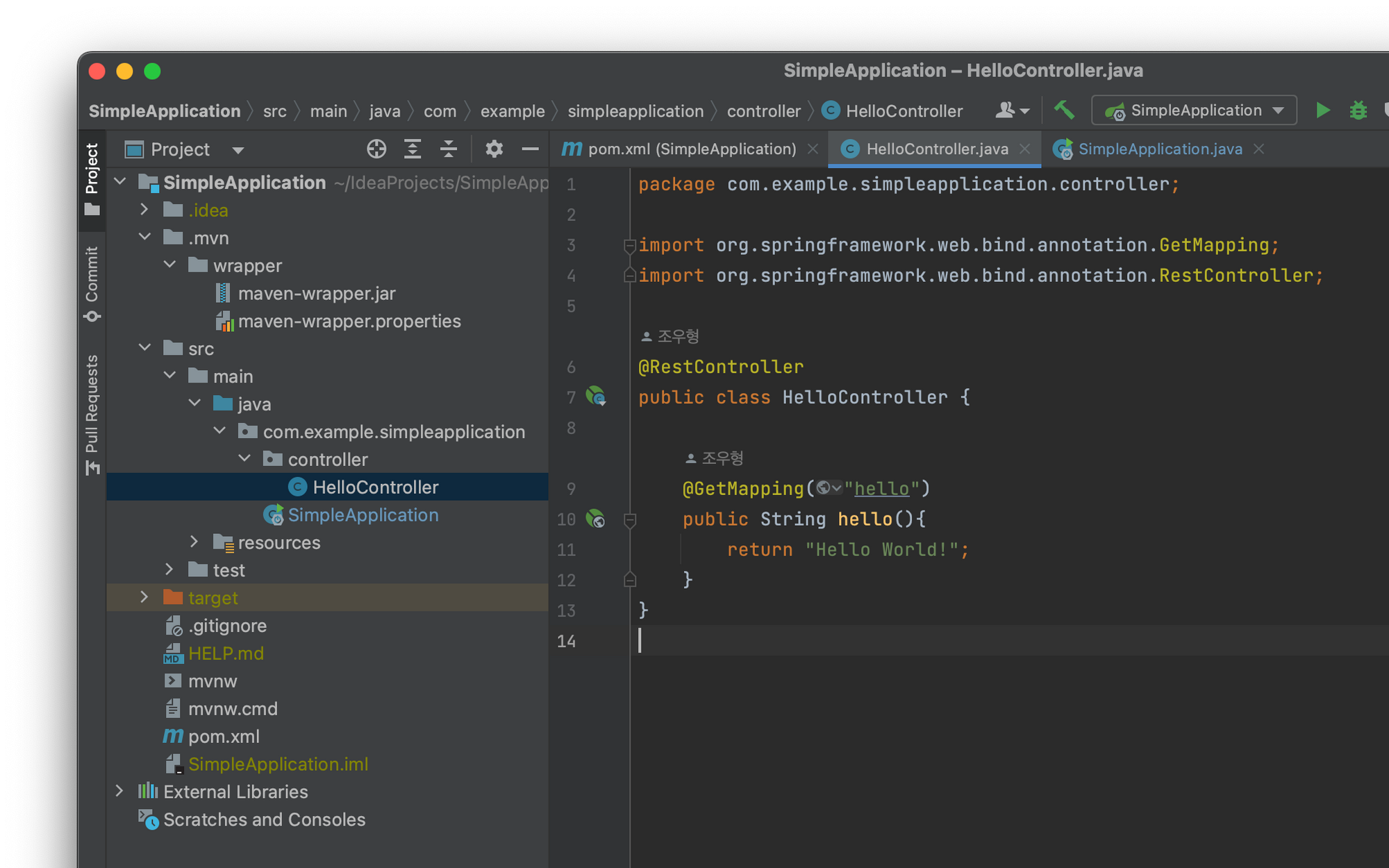 - SpringBoot로 “hello” GET 요청이 들어오면 “Hello World!” 문자열을 반환하는 아아아주 간단한 애플리케이션 구현