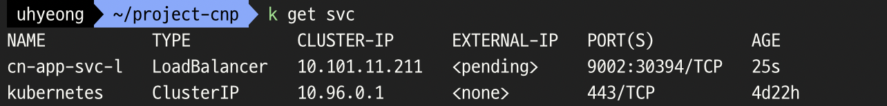 - 서비스 배포 후 확인해 보니 EXTERNAL-IP 가 계속 pending 상태인 것을 확인