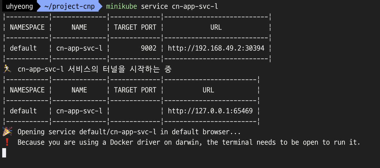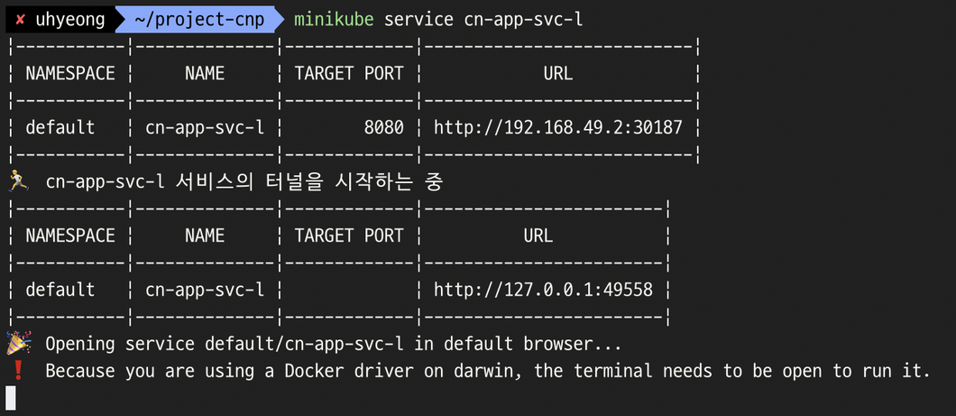 - 결국 위 안내를 받아 minikube service 명령어 수행