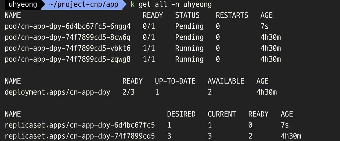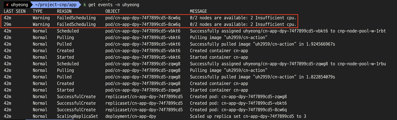 - 스케일 업으로 수정된 버전인 새로운 파드 생성을 하다가 할당할 cpu 자원이 부족해서 고착되었다,,,