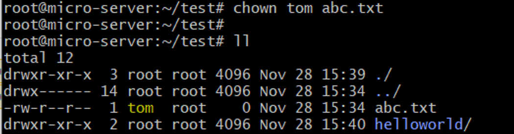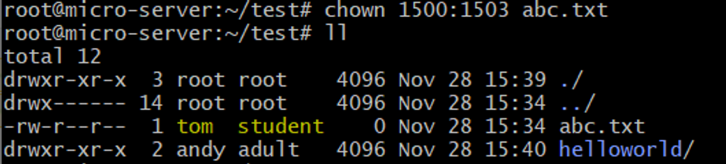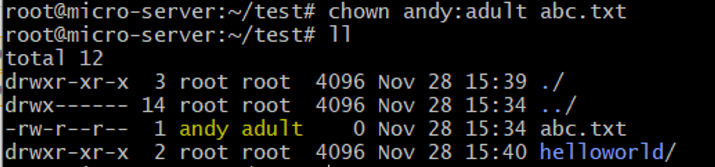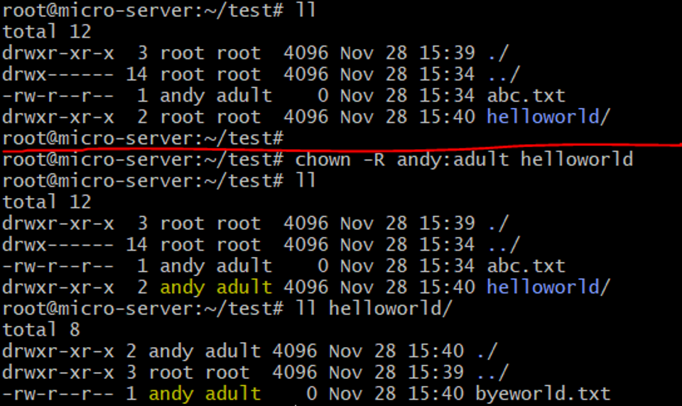 - chown -R andy:adult helloworld