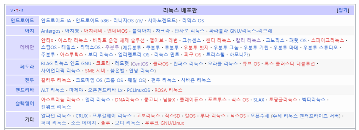 - 따라서 배포판에 따라 서버 운영, IoT, 모바일, 일반 사용자 등.. 다양한 목적으로 나눠져 다른 기능과 프로그램을 제공한다는 걸 알 수 있다.