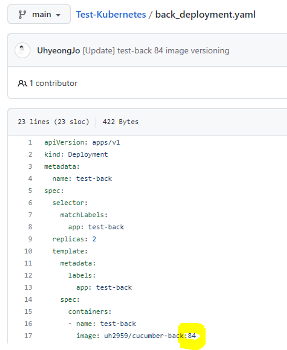 - Kubernetes Deployment Manifest 파일에 도커 이미지 태그 수정
