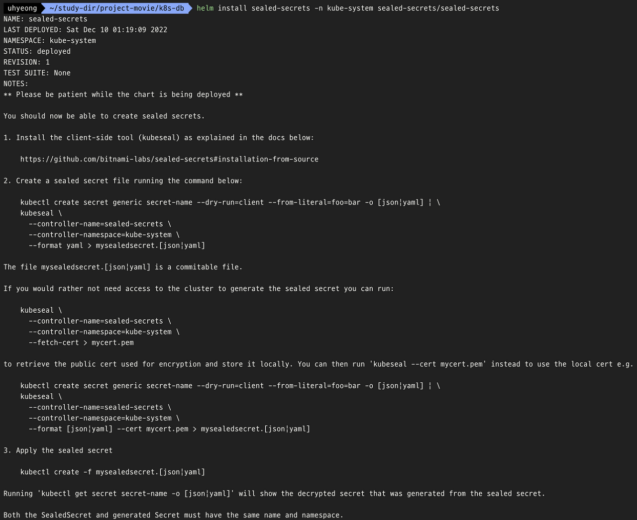- $ helm install sealed-secrets -n kube-system sealed-secrets/sealed-secrets